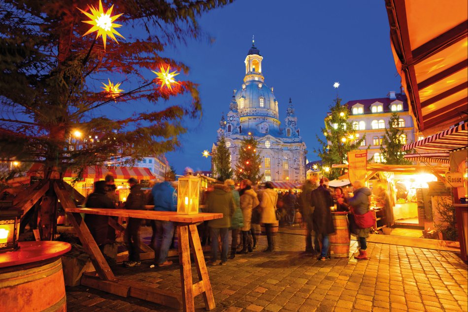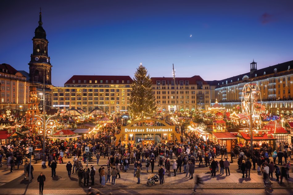 Zur Adventszeit hüllt sich das barocke „Elbflorenz“ in einen ganz besonderen Zauber. Die herrliche Altstadt Dresdens strahlt eine festliche Atmosphäre aus, die jeden in Weihnachtsstimmung versetzt. Unter den zahlreichen Weihnachtsmärkten der Stadt ist der Striezelmarkt der wohl schönste – und zugleich der älteste Deutschlands, denn er besteht bereits seit 1434. Mitten auf dem Altmarkt ragt die berühmte Stufenpyramide aus dem Erzgebirge empor – mit ihren sechs Etagen und 43 kunstvoll geschnitzten Figuren ist sie mit ihren rund 15 Metern die größte ihrer Art weltweit. Um sie herum laden über 200 festlich geschmückte Stände zum Stöbern, Schlemmen und Genießen ein.