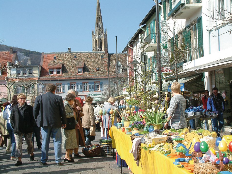 Durch die gesamte, österlich dekorierte Innenstadt zieht sich der Osterglockenmarkt mit seinen 80 auswärtigen Händlern. Wer Keramik, Schmuck, Korbwaren oder Sandsteinarbeiten sucht, wird hier ebenso fündig wie der, der den verkaufsoffenen Sonntag zum Shoppen nutzen möchte. Für das leibliche Wohl sorgen neben den ansässigen Gastronomen wieder Beschicker aus verschiedenen kulinarischen Regionen. Wie es sich für Bad Dürkheim gehört, werden natürlich auch die besten einheimischen Weine und Sekte angeboten.