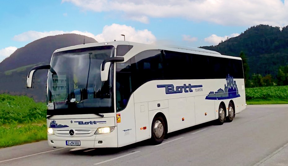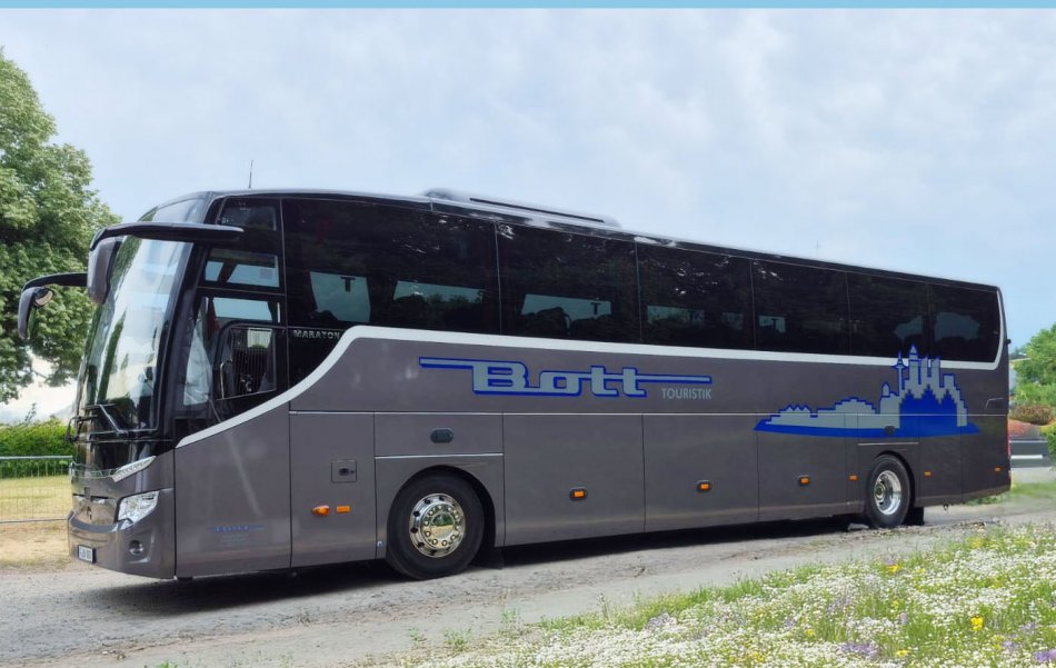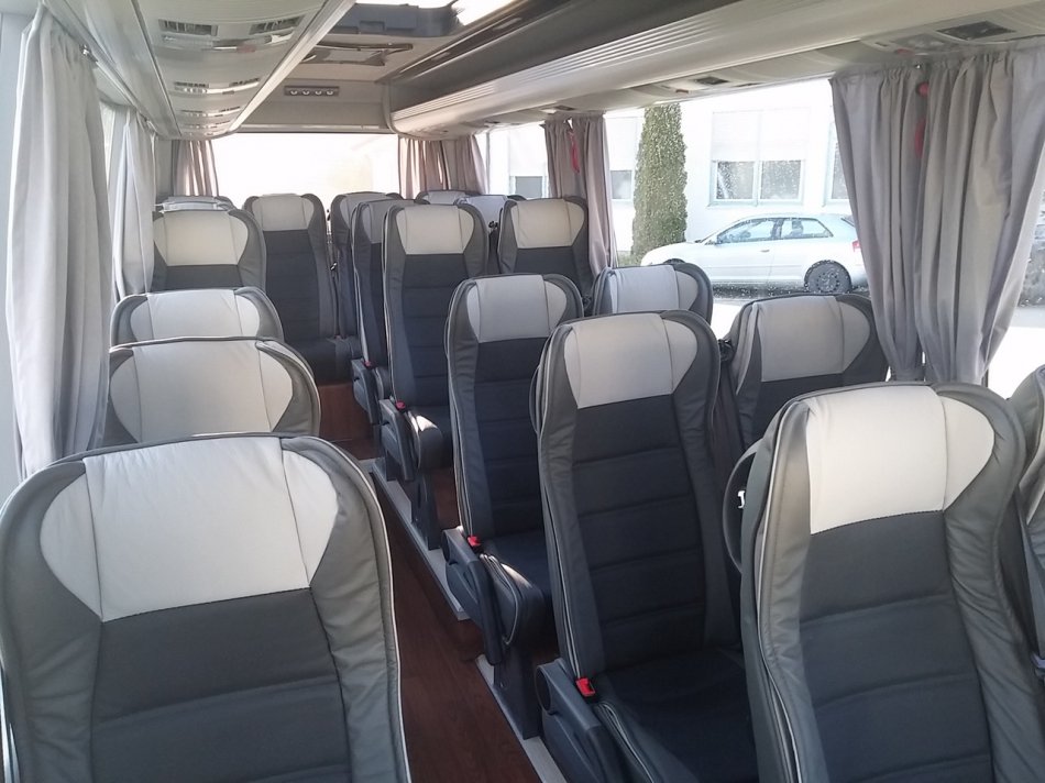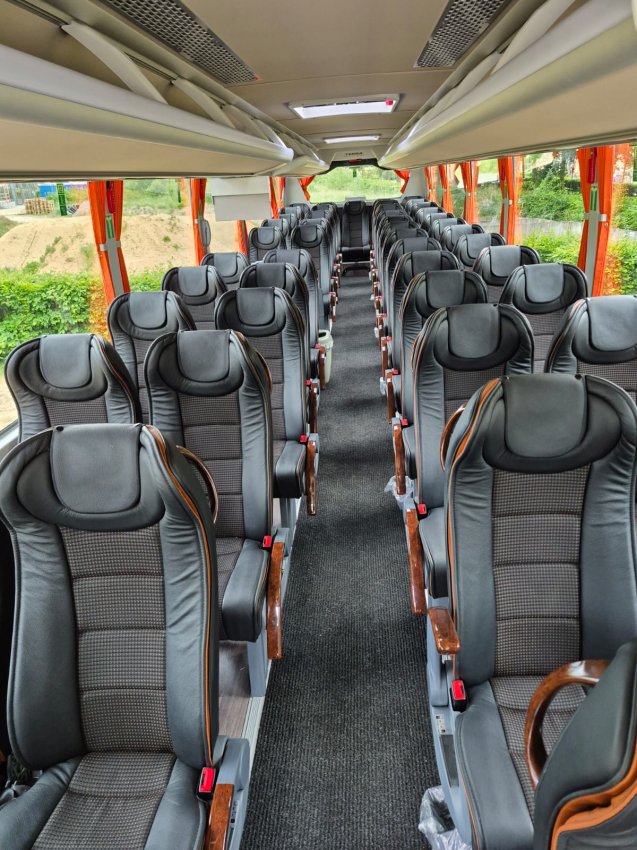 Reisebus mit 32+1 Sitzplätzen, WC, Video, Bordküche, Kühlschrank, Sicherheitsgurte, Fußstützen, Klapptische, USB-Lademöglichkeit, modernste Sicherheitstechnik mit Bremassistent, Euro VI-Norm