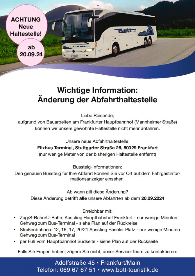 - Zug/S-Bahn/U-Bahn: Ausstieg Hauptbahnhof Frankfurt - nur wenige Minuten Gehweg zum Bus-Terminal